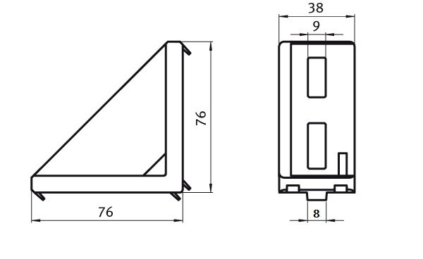 Vinkelfäste 38x76x76. M8. T-spår 8. 1st.